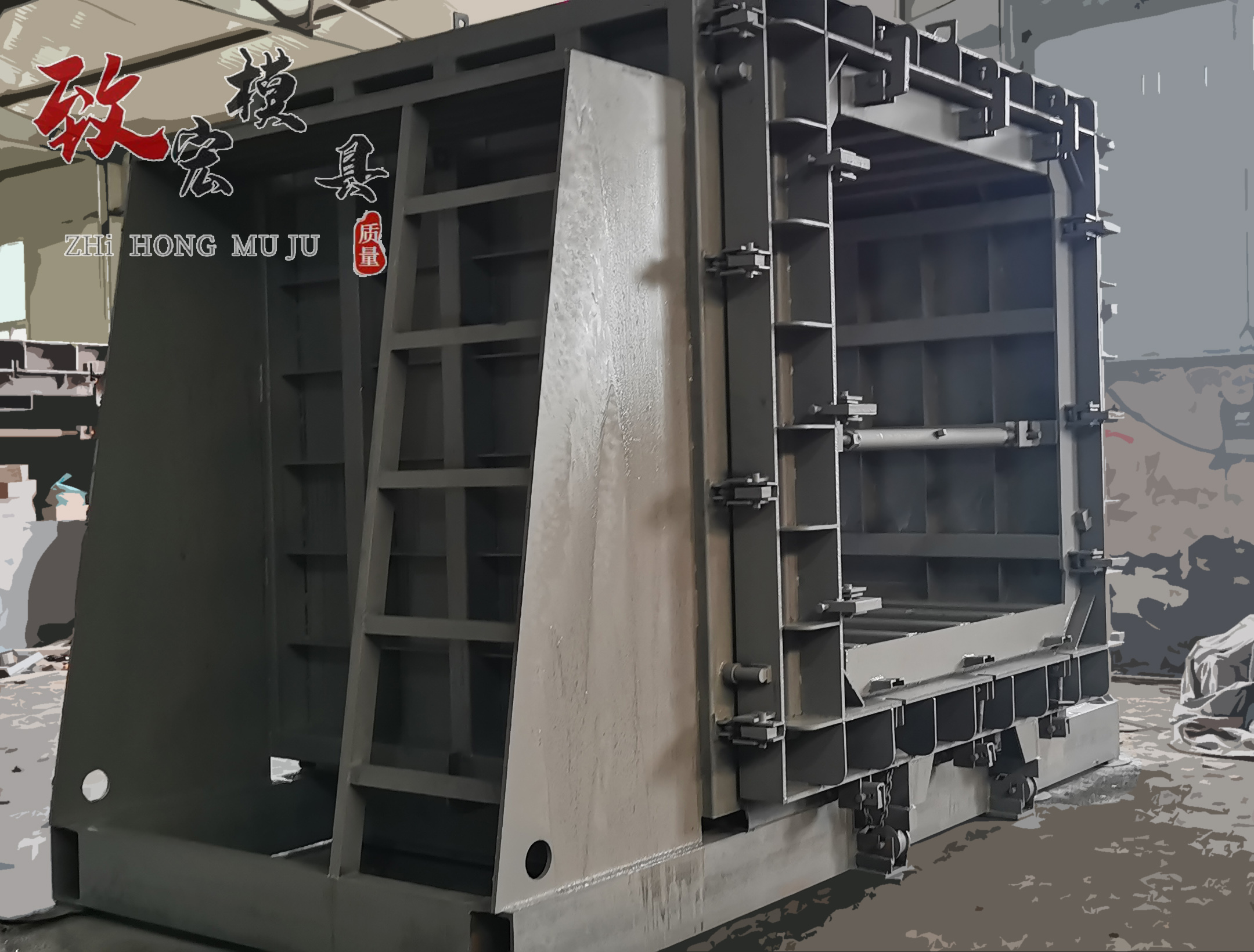 內模位于由兩個側模架、兩個端模架和底模組成的模具內,側模架由模架和模架座組成,模架的內模架下端通過鉸鏈與模架座鉸接,模架的外模架下端通過伸縮連桿與模架座鉸接;端模架由四個轉角模塊和一個或多個矩形模塊拼接,形成不同尺寸的端模架;內模由兩個上角模塊、一個或多個橫向上模塊和兩個內角模塊組成,橫向上模塊兩端分別與兩個上角模塊的橫板連接,上角模塊的兩個立板分別與內角模塊連接;底模由多個矩形模板組成,矩形模板的底部設有支撐腳。